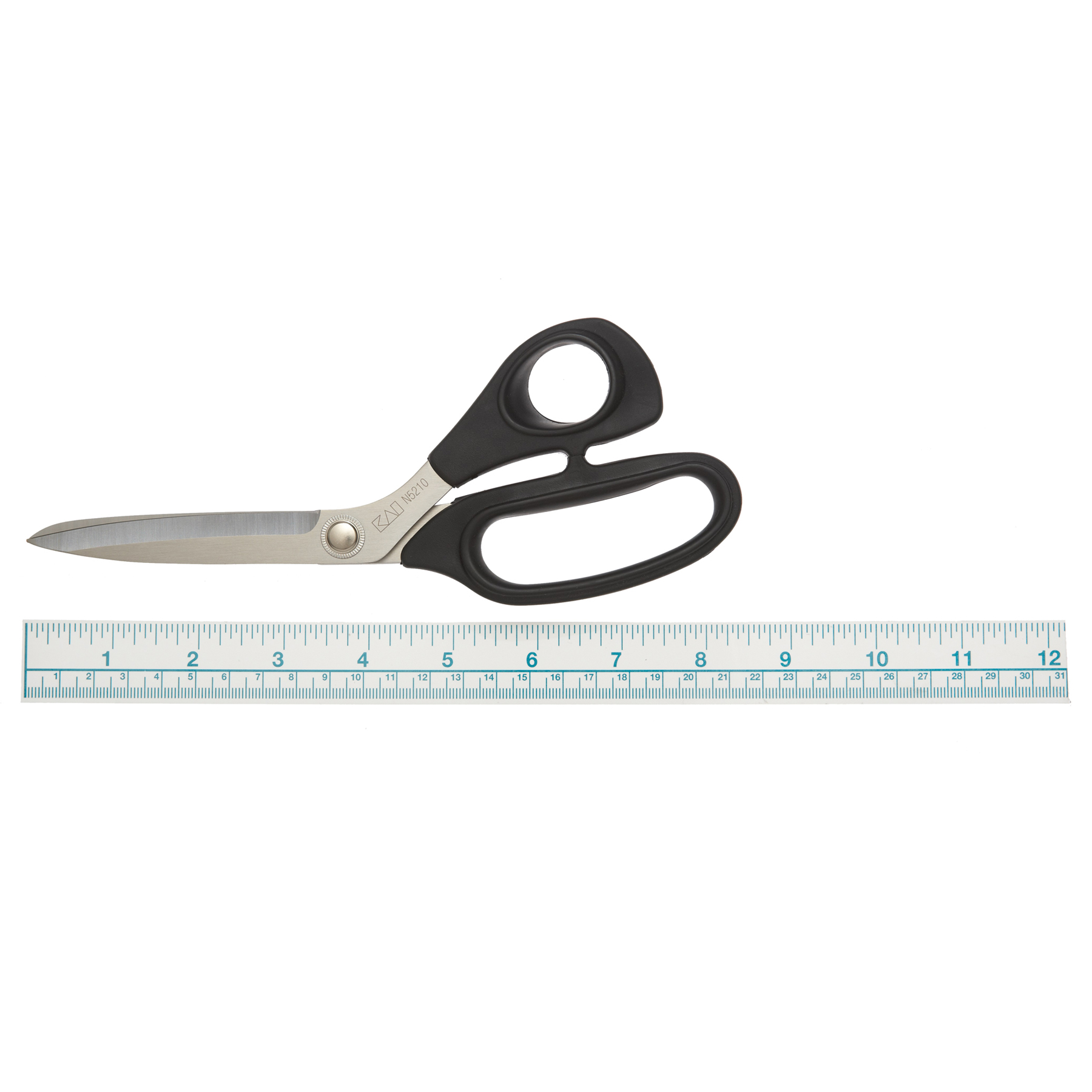 The Kai N5210 - 8" scissors have ergonomically soft handles which allow fatigue-free cutting on all types of fabric. Cuts multiple layers of denim with ease while trimming cottons without any fabric slippage. The Kai N5210 is the standard size handle and blade length.
