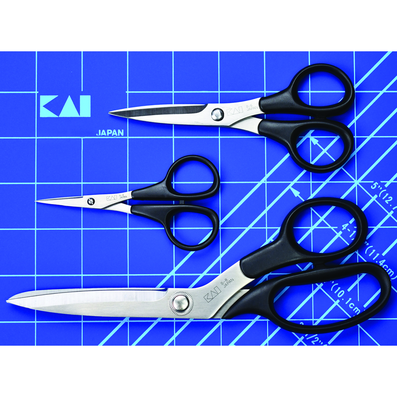 The Kai S-Series Set includes our most popular scissors sizes. The S-Series was the precursor to the ever popular 5000 series.  The main difference is the hard plastic handles on the S-series and softer Elastomer handles on the 5000 series. The smooth, sharp blades give the Kai scissors an amazing smoothness in cut and feel.  Whether it is for a friend, family member, or even yourself, this is the premier set for those seeking out performance-level scissors.   This set includes: 1 S-4 (4" Needle Craft Scissors):  Sharp pointed tips allow for detailed cutting and trimming. Extremely popular for trimming threads, Hardanger embroidery, beadwork, rug hooking, and fly tying for fishermen. 1 S-5 (5 1/2" Scissors):  Quilters love this size for trimming "dog ears" and clipping threads when chain piecing. This smooth, comfortable scissor is perfect in your sewing kit for take along projects and sewing classes. 1 S-8 (8" Dressmaking Shears):  These 8-inch scissors have ergonomically right handles which allow fatigue-free cutting on all types of fabric. Cuts multiple layers of denim with ease while trimming cottons without any fabric slippage.  Free shipping for orders in the USA. Additional shipping fee for international orders