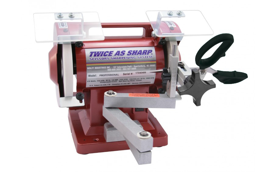 The Twice as Sharp® Professional Scissors Sharpener is designed to make sharpening shears fast, easy, and precise. The professional system comes equipped with a 100 grit sharpening wheel and a 600 grit professional honing wheel is also included to highly polish your edge leaving a shiny cosmetic finish. The professional honing wheel is designed for pet grooming shears, high quality fabric shears, and low priced barber and beauty shears.